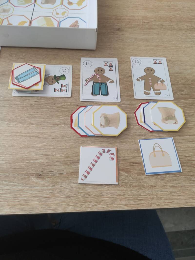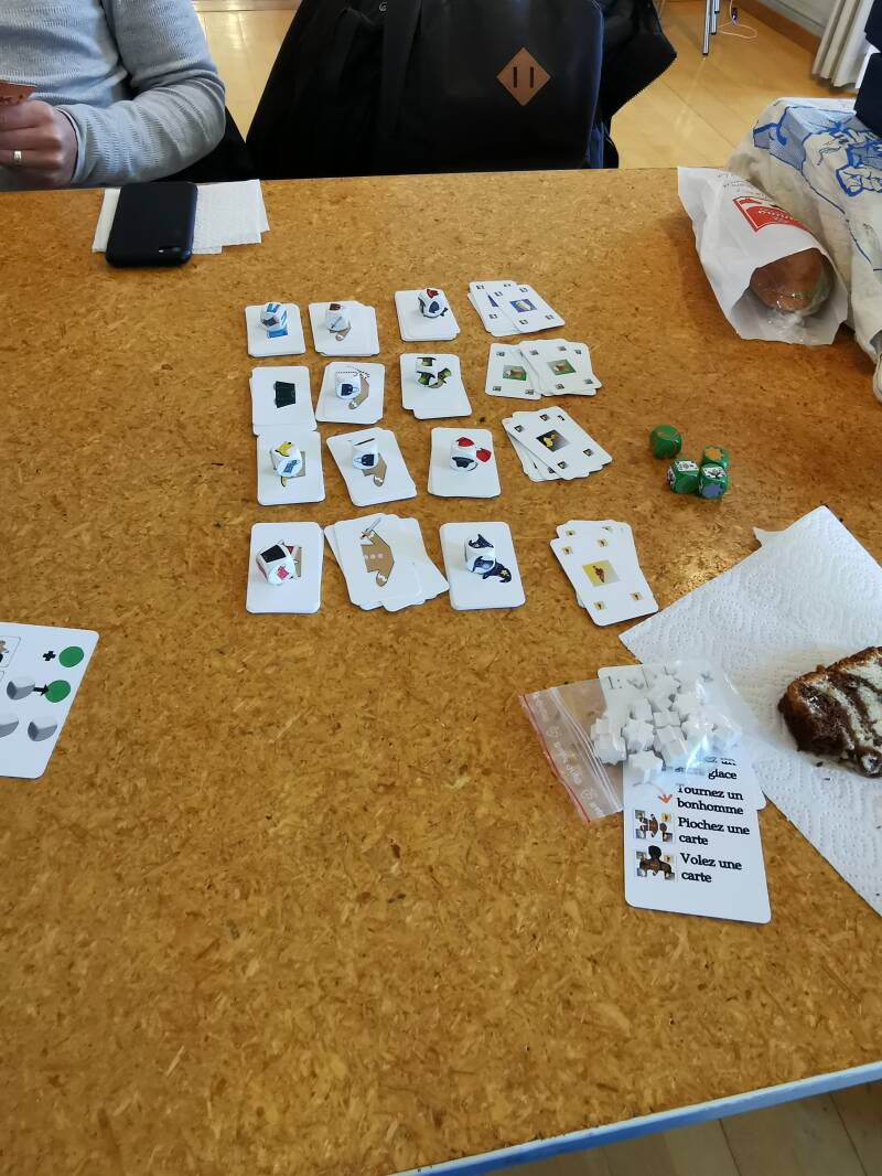 - soit choisir deux dés, et les lancer pour récupérer les ingrédient (visible sur le plateau) et décorations (visibles sur les dés)